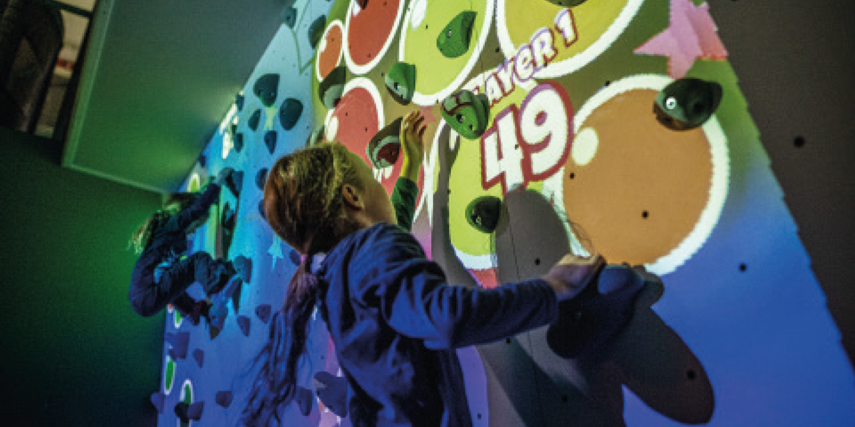 An avid climber, Kajastila first applied Valo Motion to creating games for climbing walls. The company’s ValoClimb product consists of eight games. Most of these feature simple game mechanics, displayed on the wall. In Whack-a-Bat, a climber in a projected cartoon forest environment swats away monster mammals with their hands. In Climball, two climbers volley and return a digital ball, competing in a cliff-face version of the classic video game, Pong.